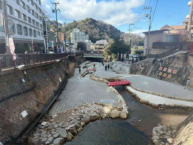 A beautiful river runs through the downtown area of Arimo Onsen and young people love to take a leisurely stroll near the river.